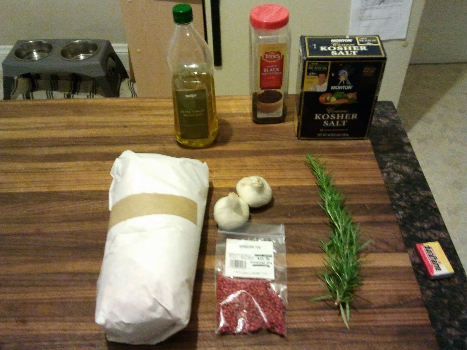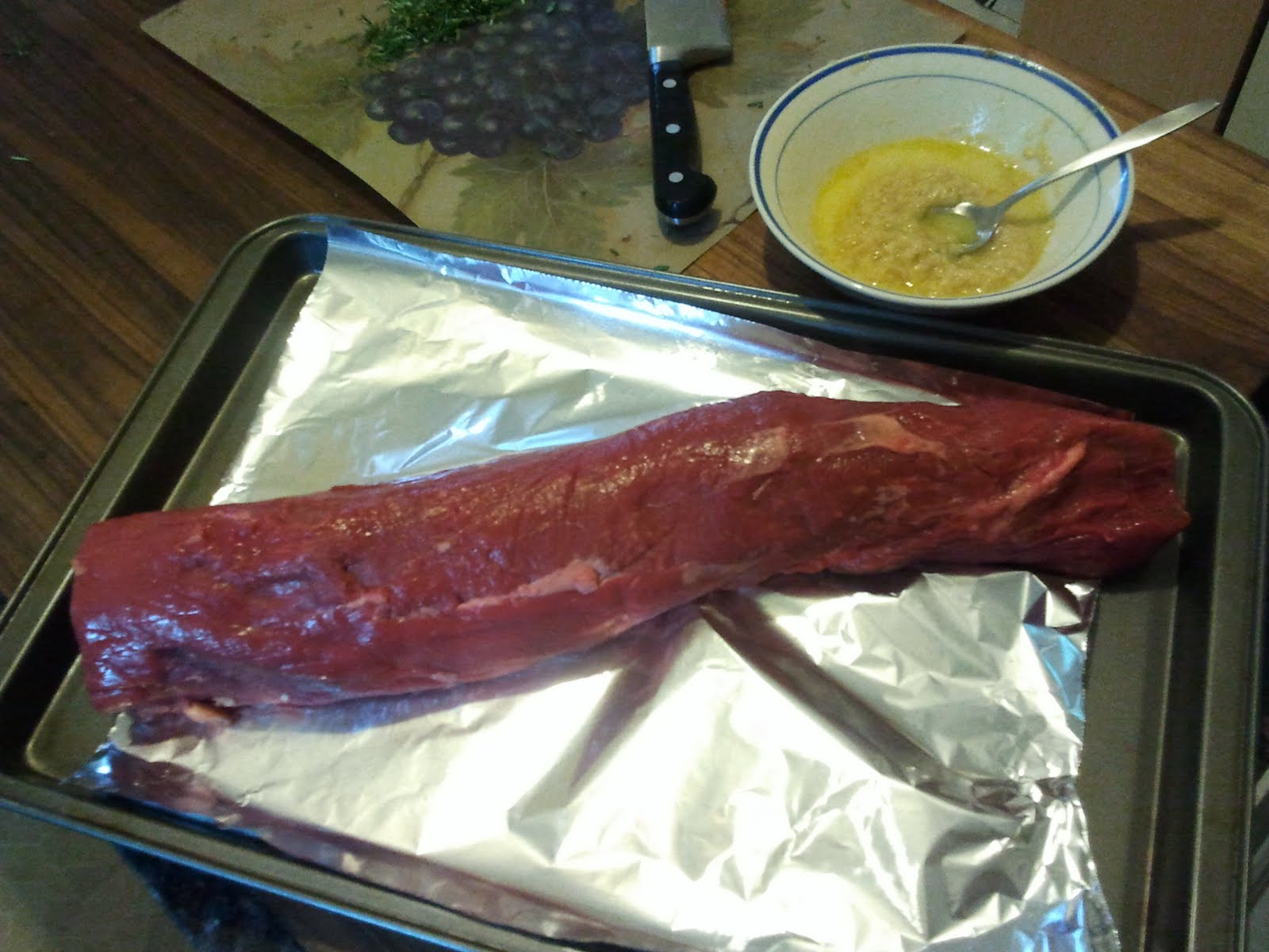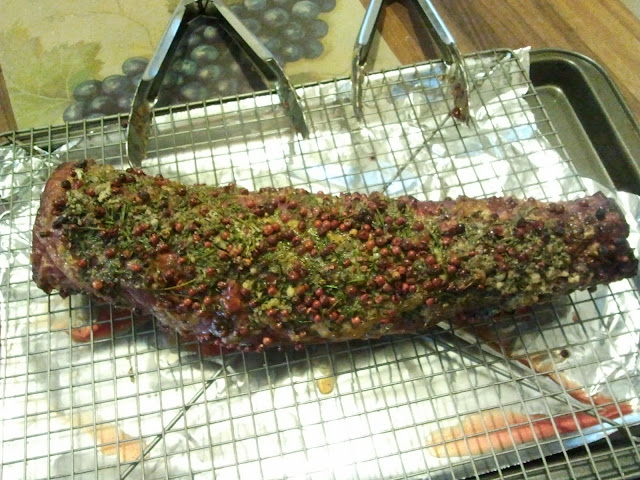 I rubbed the paste all over the tenderloin, and then spread on the red peppercorn and rosemary blend. This was done in secrecy, in an attempt to surprise the gentlemen later.