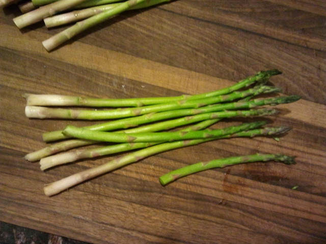 Asparagus essentially has three parts: the tip, the fleshy stalk, and the woody stalk. The fleshy stalk and woody stalk will naturally split from each other in the right spot if you take each end of the spear and bend it in the middle.