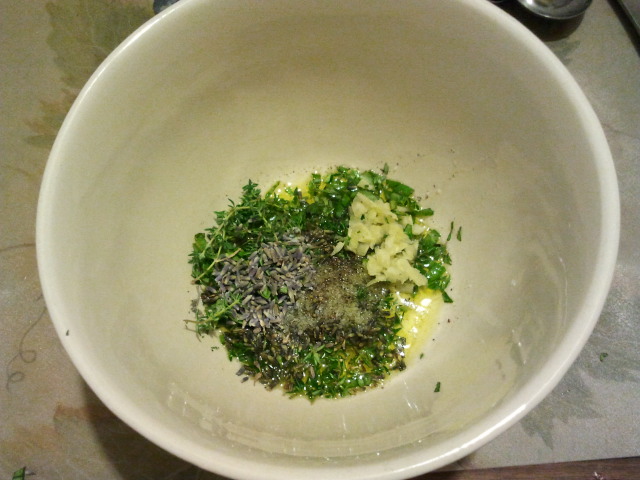 Similar to making a rub first, as in most of the recipes here, I began by making the paste. It was interesting to use the dried lavender that I had been sitting on since using some to make lavender-infused honey earlier in the summer. This certainly had a Provencal feel to it.
