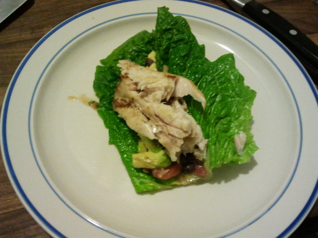 I, unlike my better half, enjoy fish as my protein in tacos. Wanting to keep the carb count down, I opted to use a lettuce wrap instead of a tortilla shell. I shredded a bit of the less-visually appealing fillet and placed it in the lettuce piece with the salsa.