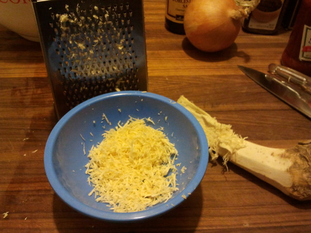 The cocktail sauce calls for prepared horseradish, but the stuff you find at the grocery store just doesn't have the kick that I would like. Years ago I learned how to make my own from scratch, and it is SO much better and ridiculously easy to do. Start by peeling the horseradish root.