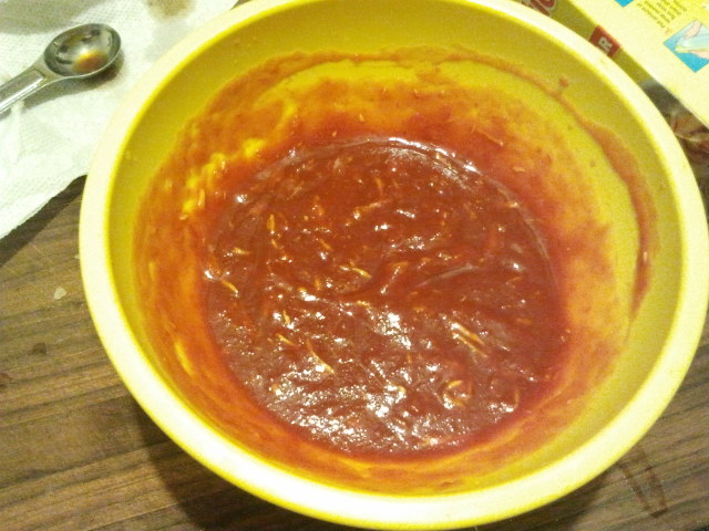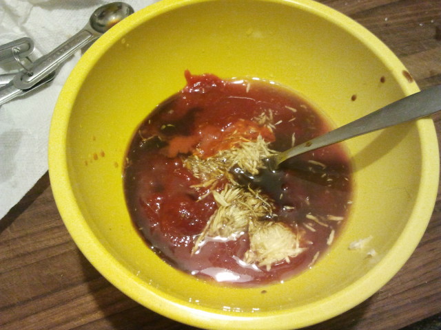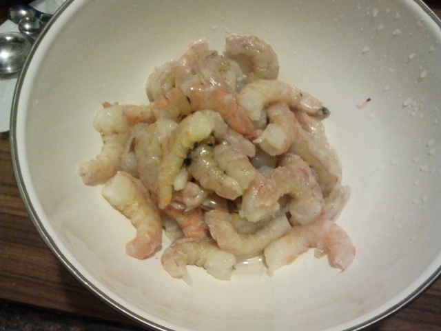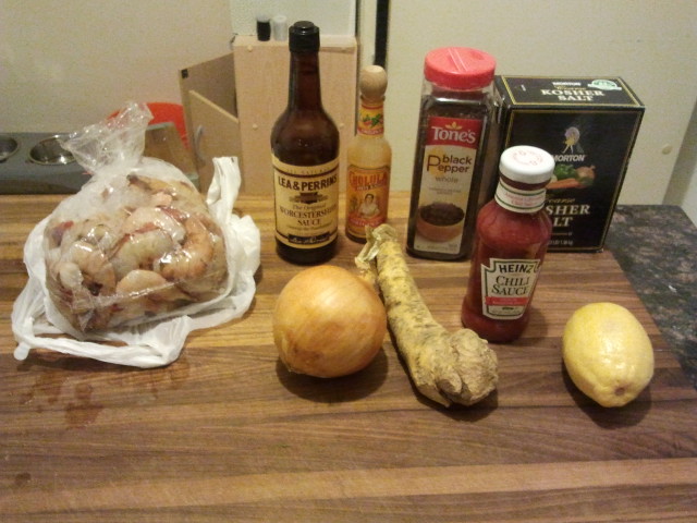 Some gentle stirring later, I had a nice cocktail sauce. I covered it with plastic wrap and set it in the fridge while I prepared the shrimp.