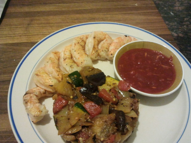 The cocktail sauce takes all of five minutes, and will make you a stud at your next party. Seriously, this stuff is terrific. The shrimp acted as a canvas for which to adorn with flavor from the sauce, instead of the other way around. Friends WILL see this sauce if we ever have a need for shrimp appetizers at a gathering. The onions didn't seem to serve much purpose, though. I didn't even plate them, especially since I had other (and more interesting) vegetables. I couldn't imagine anyone just eating leaves of plain grilled onions. Otherwise, this meal was a happy success.