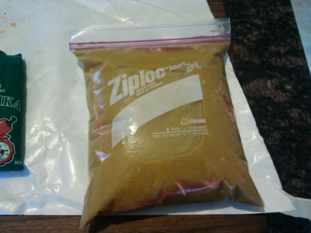 The "shot" reference in the title concerns a bourbon-based marinade followed by the application of a rub before grilling. I wasn't terribly excited about the prospect of repeating the oaky adventure from yesterday, but I forged ahead to see what this recipe had to offer. I did select a different bourbon, opting for Woodford this time around. I made the marinade, and placed everything into a Ziploc bag for two hours.