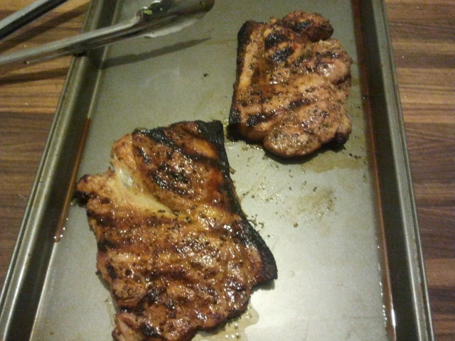 This second "shot" at bourbon treated me rather well. Unlike yesterday's episode, this recipe allowed me to taste bourbon beyond the oak. I picked up on the caramel, butterscotch, and coffee tones, even behind the frontal notes of the rub, which was quite diverse and interesting, not to mention spicy. If you have never tried a pork blade steak, I highly encourage you to do so. As they are cut from the pork shoulder, a rather inexpensive cut of meat, they are a terrifically flavored and economic way to dine. They absorb marinades quite well, and remain juicy even when cut thin. Give them a "shot!"