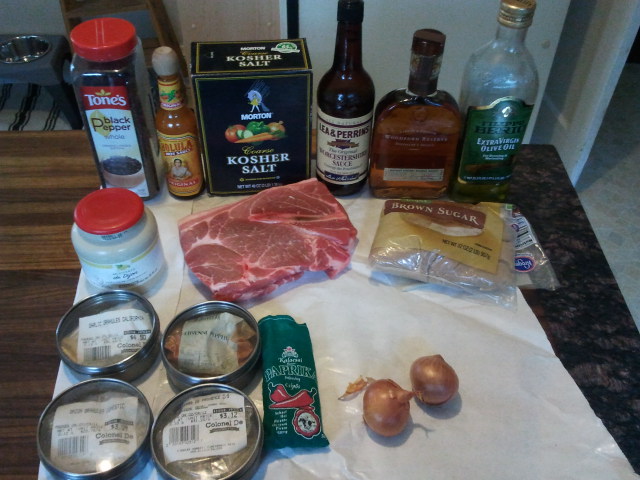 A second round of bourbon wasn't in the original plans. After work, I consulted The Guide looking for ideas. As I came across the Lamb section, I noticed that I had not been paying due diligence to these pages. Taking this into consideration, I drove down to Findlay Market to acquire what I needed. When I arrived there, I learned that they were out of ground lamb, my primary ingredient. They did, however, have pork shoulder blade steaks, something usually reserved for the weekend. I had been craving this cut of meat recently, so I took advantage of this opportunity. This would require, oddly enough, for me to use the last recipe available for this cut, the Double-Shot Blade Steaks on page 177.