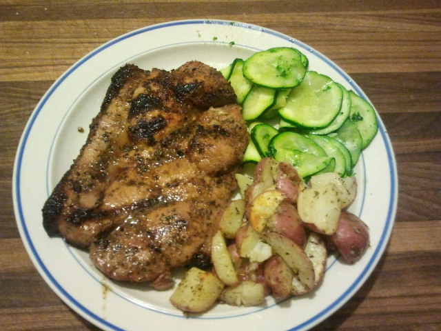 I plated the steaks and my sides (sauteed zucchini and roasted potatoes). The Bride was off at dinner with friends, so I dined alone.