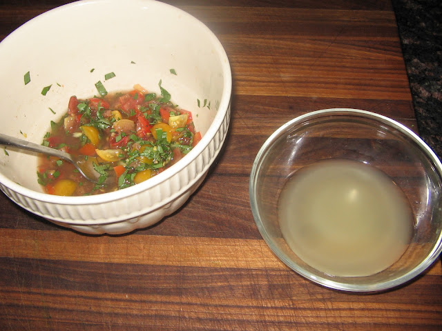 The Bride pulled into the driveway, so I had one last step to complete. On the right is a bit of chicken stock. I heated that in the microwave, added it to the tomato mixture on the left, and then stirred.