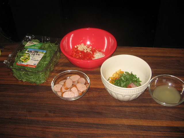 I'm worried that I may be getting The Bride a little too used to me being home for the summer. :) Yesterday, as the day came to a close, she said that she would be home for lunch, and that she would like a salad (SURPRISE!). I wanted something a little interesting, so I picked out the Sausage Salad With Arugula on page 357.