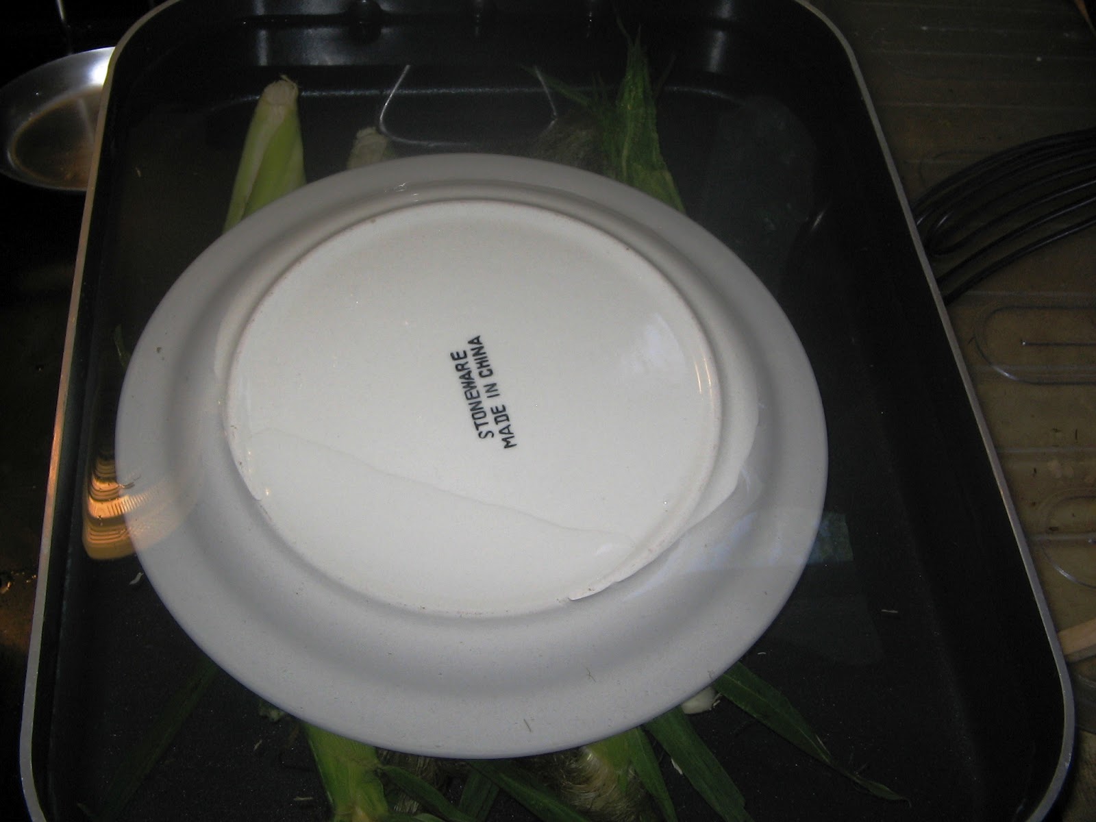 In reality, the only item that was grilled was the corn. To grill corn, as I have done for this blog in the past, you have to soak the husk. So I placed the ears in a roasting pan, filled it with water, and then used a plate to keep them submerged.