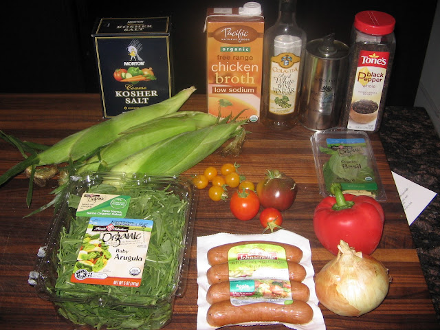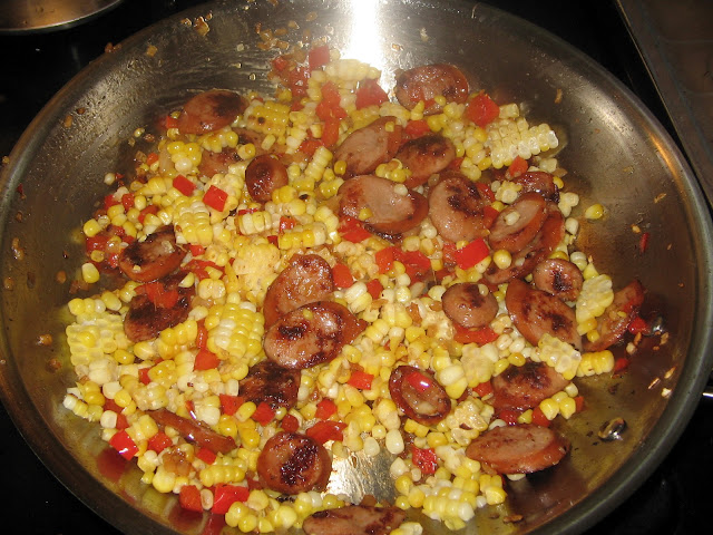 The ears take about twenty to twenty-five minutes on the grill, so I used that time to start the rest of the salad. The first ingredient to go into the saute pan was sausage. The recipe calls for andouille, which is usually made out of pork. The Diet restricts me to red meat (and yes, despite pork's slogan, it IS a red meat) so I needed an alternative. Kroger and Sons at Findlay Market does sell a chicken andouille, but I didn't have time this morning to run down there. Thus, I settled for chicken and apple sausage.