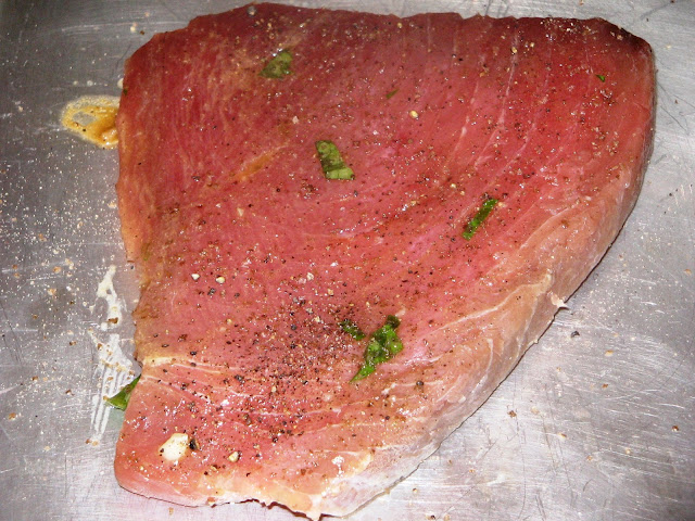 Instead of just brushing the tuna steak with olive oil, I used the olive oil based dressing from the side dish. I figured this would lend some continuity to the meal.