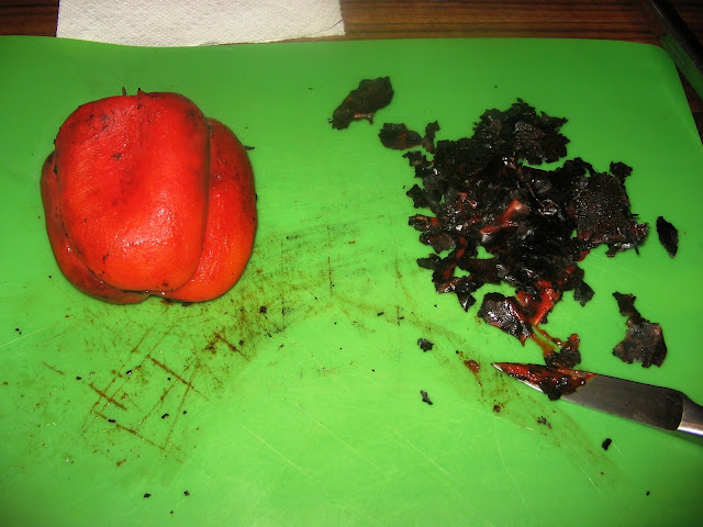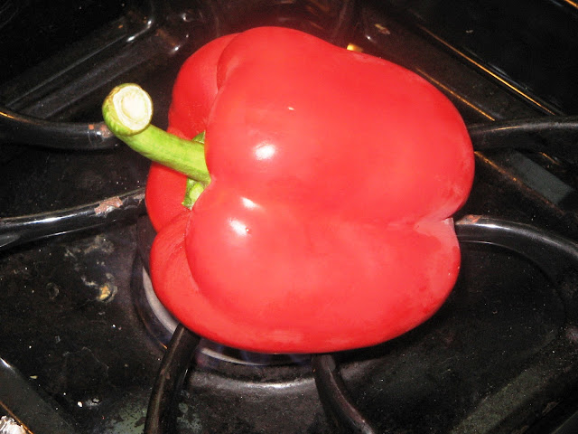 Yup, another substitute. Ever try to find Opah in Cincinnati? Weber suggests making the sauce a few hours ahead of time to allow the flavors to meld. I didn't want to fire up the grill just to roast a single pepper, so I reused the range burner technique.