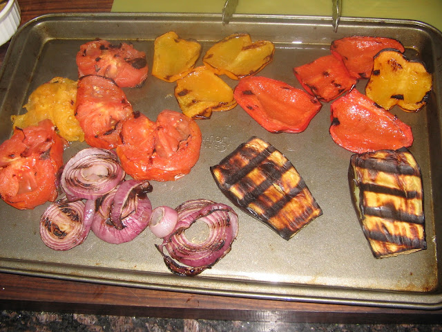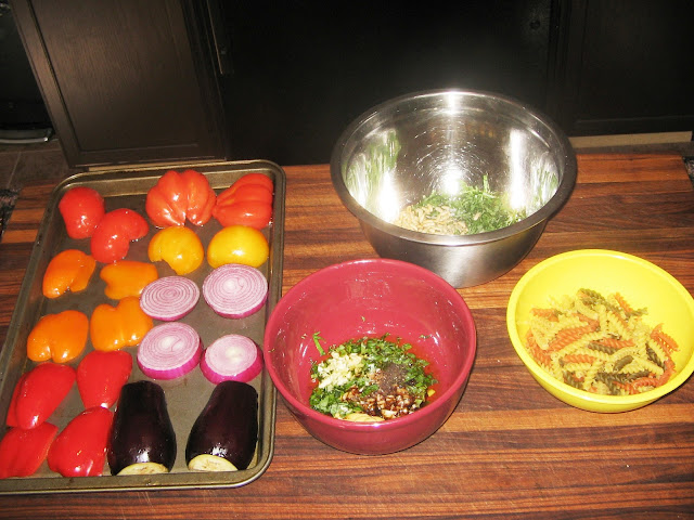 I hadn't had pasta yet this week (The Diet restricts me to having it just once a week) so I selected the Grilled Vegetable Pasta Salad on page 343. I was happy to see my Kroger finally carry baby eggplant instead of the behemoths they usually stock. The smaller ones have far less seeds and are much more tender.