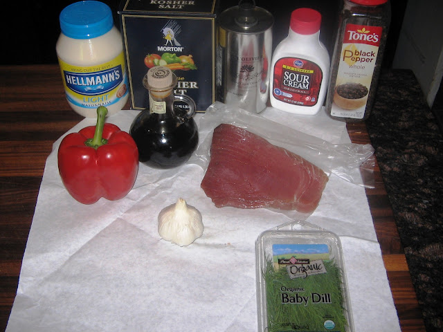 For crying out loud, all I really want right now is a double cheeseburger from McDonald's, and I don't even really like McDonald's. The Diet and The Exercise continue to work, with even The Bride making a comment that she can notice a difference now. Thus, I can't give it up just yet. After goofing off a bit too much this morning, I finally picked out and went in search of ingredients for the Opah Tuna With Creamy Roasted Red Pepper Sauce on page 286.