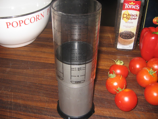 The recipe calls for one and a half cups of chopped tomato, so I set my adjustable measuring cup to that mark and began processing the tomatoes.
