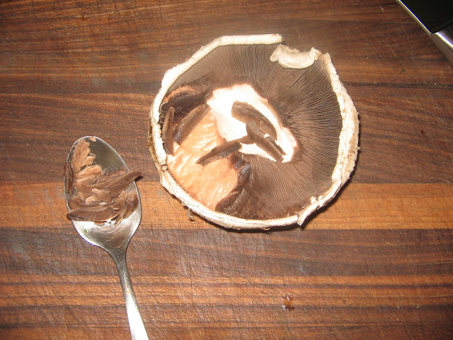 When working with portabellas, the first thing to do is to rock the stem back and forth until it breaks off.