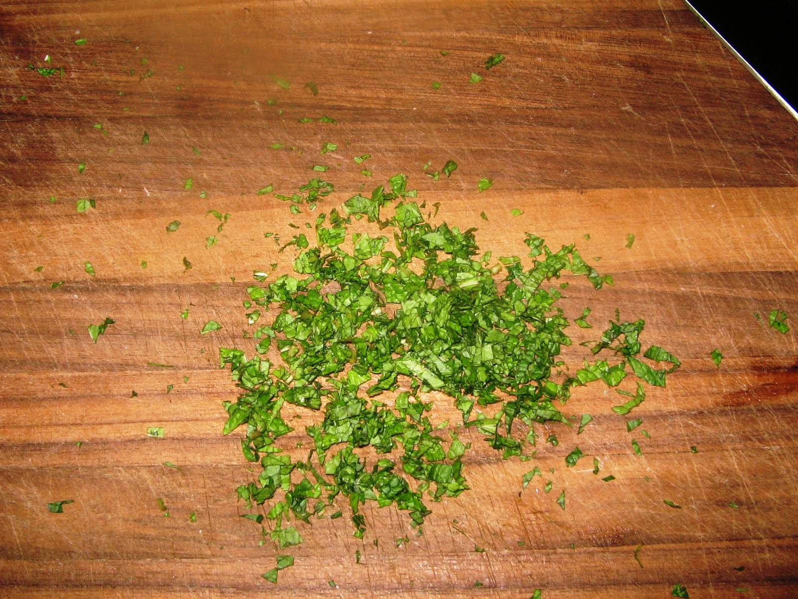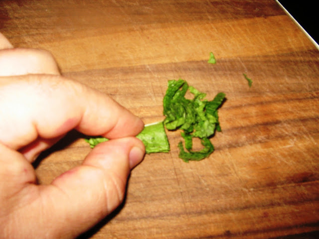 The tricky part is to roll the leaves tightly and then use your knife to cut "ribbons" of herbs.