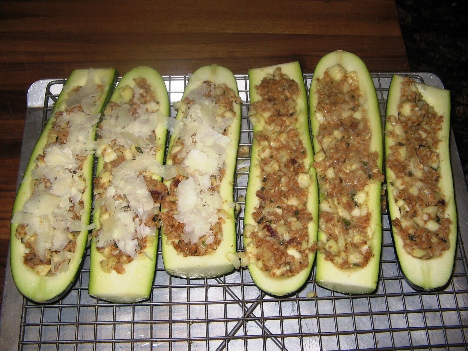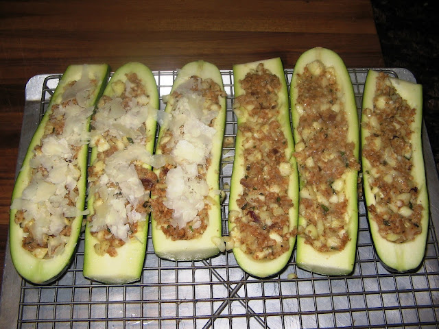As a side note, I used a melon baller to scoop out the flesh of the zucchini with pretty good success. I made the stuffing, and the following picture is with half of the stuffed zucchini covered in the final layer of cheese, and the other half about to be so that you could see what it looked like.