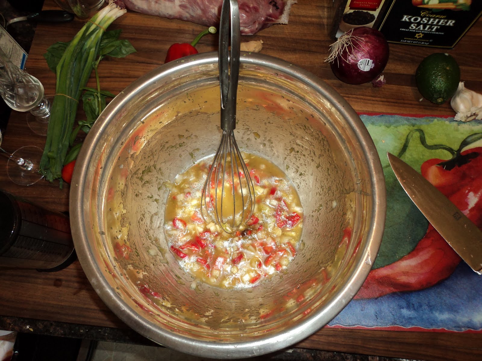 Believe it or not, we actually had almost all of this already. The only subsitution I made was to swap out the habenero (because screw THAT) with my New Mexico peppers. Oh, and for those of you ever need it, good luck finding chutney in the Norwood Kroger...it's next to the A1 sauce. Go figure. This needed to marinade for four to six hours, so that was the first thing I readied.