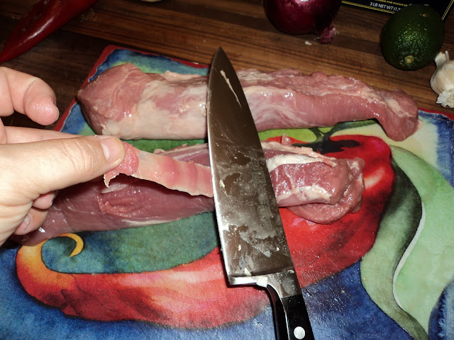 Before adding the tenderloins to the marinade, I needed to trim them. Tenderloins are awesome because they are actually leaner than boneless, skinless chicken breast, and have the advantage of tasting nothing like boneless, skinless chicken breast. However, they almost always come with a piece called silverskin, which tastes terrible and is, in fact, indigestible. The first thing to do is pull back the thin layer of fat to reveal the silverskin.