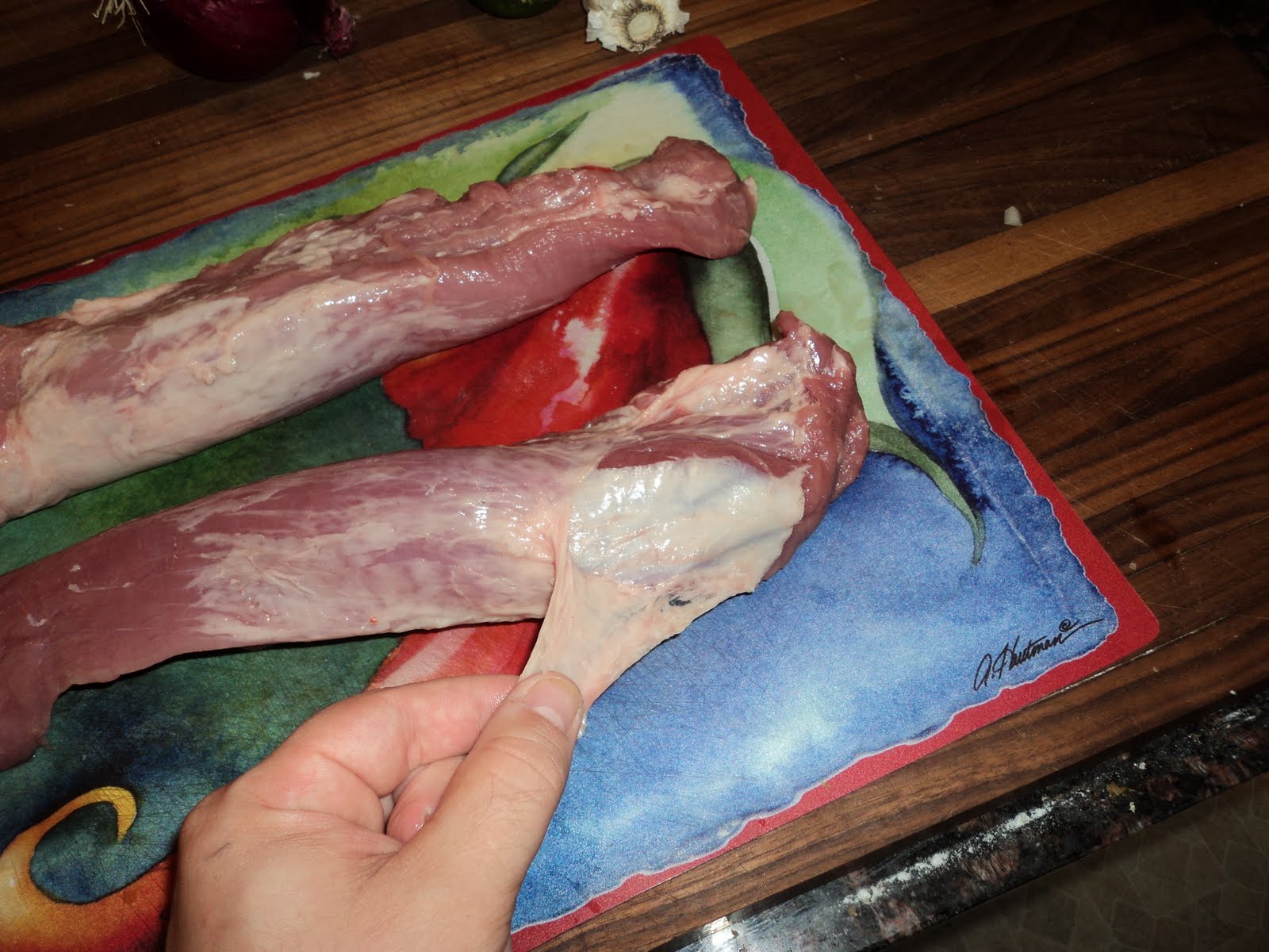 Before adding the tenderloins to the marinade, I needed to trim them. Tenderloins are awesome because they are actually leaner than boneless, skinless chicken breast, and have the advantage of tasting nothing like boneless, skinless chicken breast. However, they almost always come with a piece called silverskin, which tastes terrible and is, in fact, indigestible. The first thing to do is pull back the thin layer of fat to reveal the silverskin.