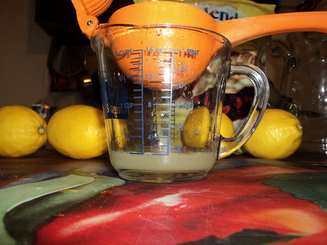 Three lemons in and the problem is becoming serious. Half of my lemons are used up, and I'm barely above one-half of a cup. In looking at the recipe, I needed a little more than one cup, so at this point not only have I given up on doubling my recipe, I am now concerned that I didn't buy enough to make one recipe.