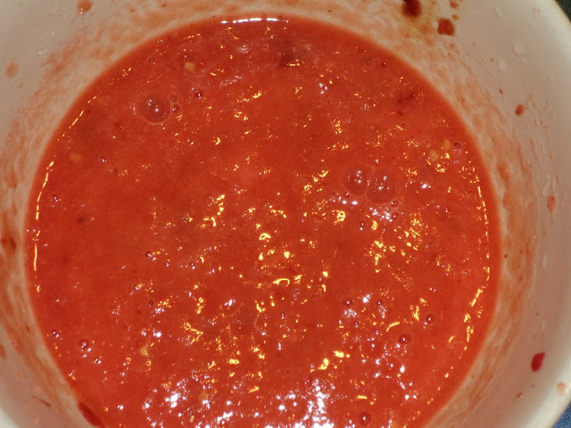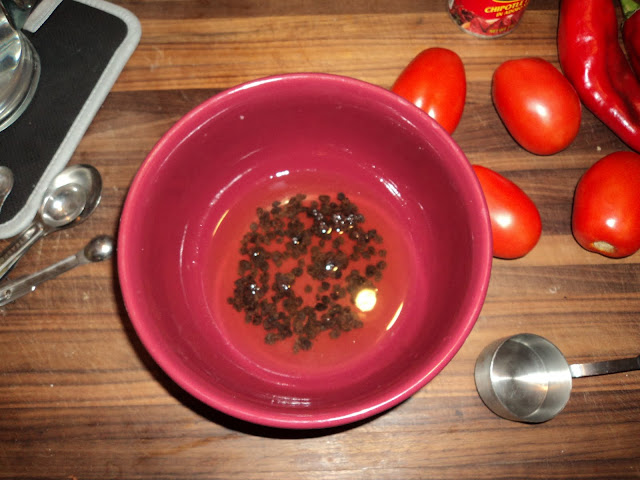 I cored and peeled the tomatoes, and added the chipotle (smoked jalapeno).
