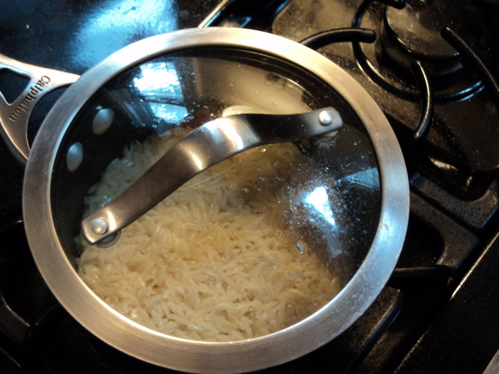 I also needed one cup of cooked rice, so I brought half of a cup of dry rice to a boil. I knew that rice generally doubles when cooked, so I wasn't too worried about that one going wrong like the lemon juice fiasco.