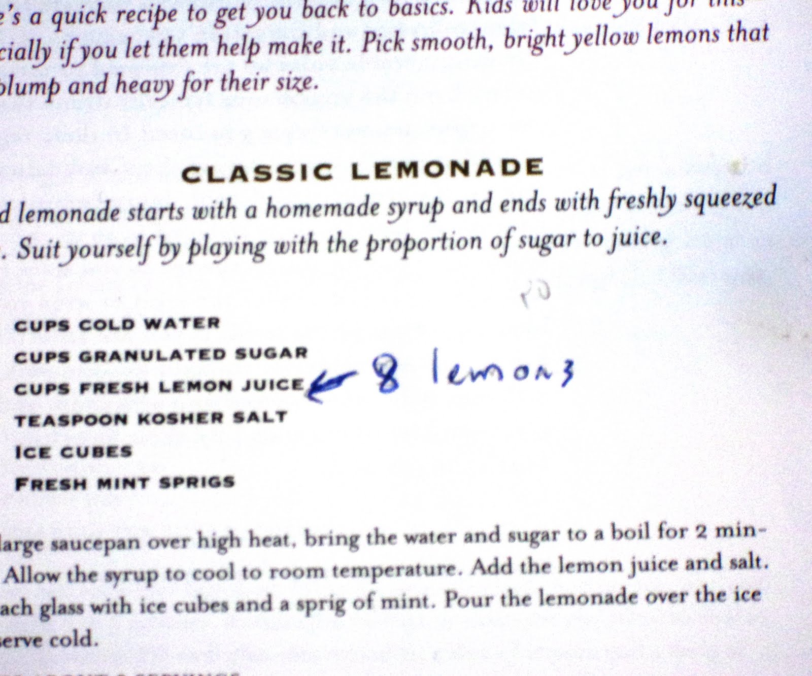 Yesterday was (hopefully) the last day of the year above ninety degrees. To celebrate that fact, I started the evening by making the Summertime Lemonade on page 35. I can't tell you the last time I had lemonade made truly from scratch, so I stopped by the grocery store on my way home from school and picked up a few lemons.