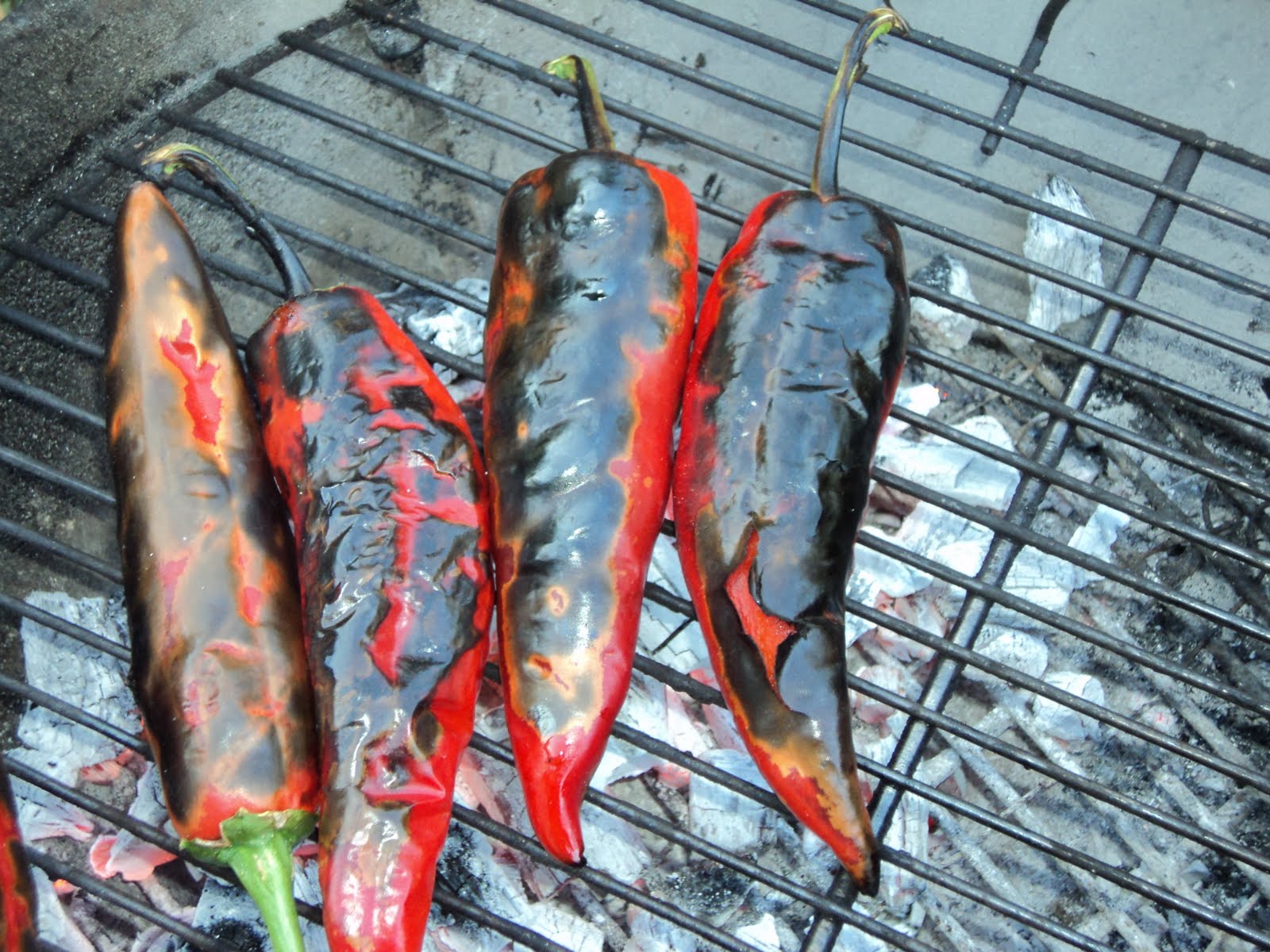The stuffing was complete and it was time to roast the peppers. One of the reasons I love New Mexico peppers is that they roast rather well. Their skin blisters beautifully, which allows them to peel easily, revealing the sweet, soft flesh underneath. First up, I threw them on the fire.