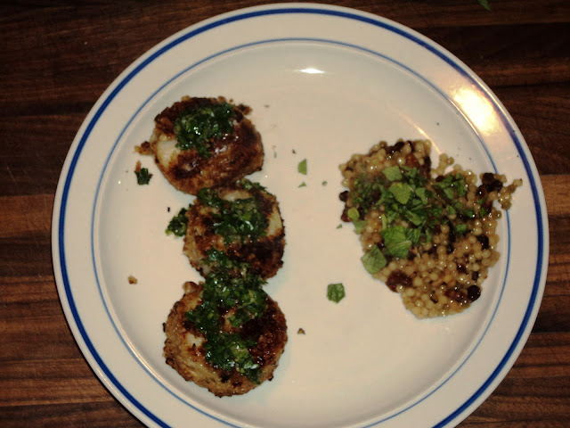 From there, you can add the couscous and let it absorb the liquid. Add in the nuts and mint, and you are set! The scallops, in the meantime, looked quite good (the bore a striking resemblance to the picture in the cookbook, so I was extra excited).
