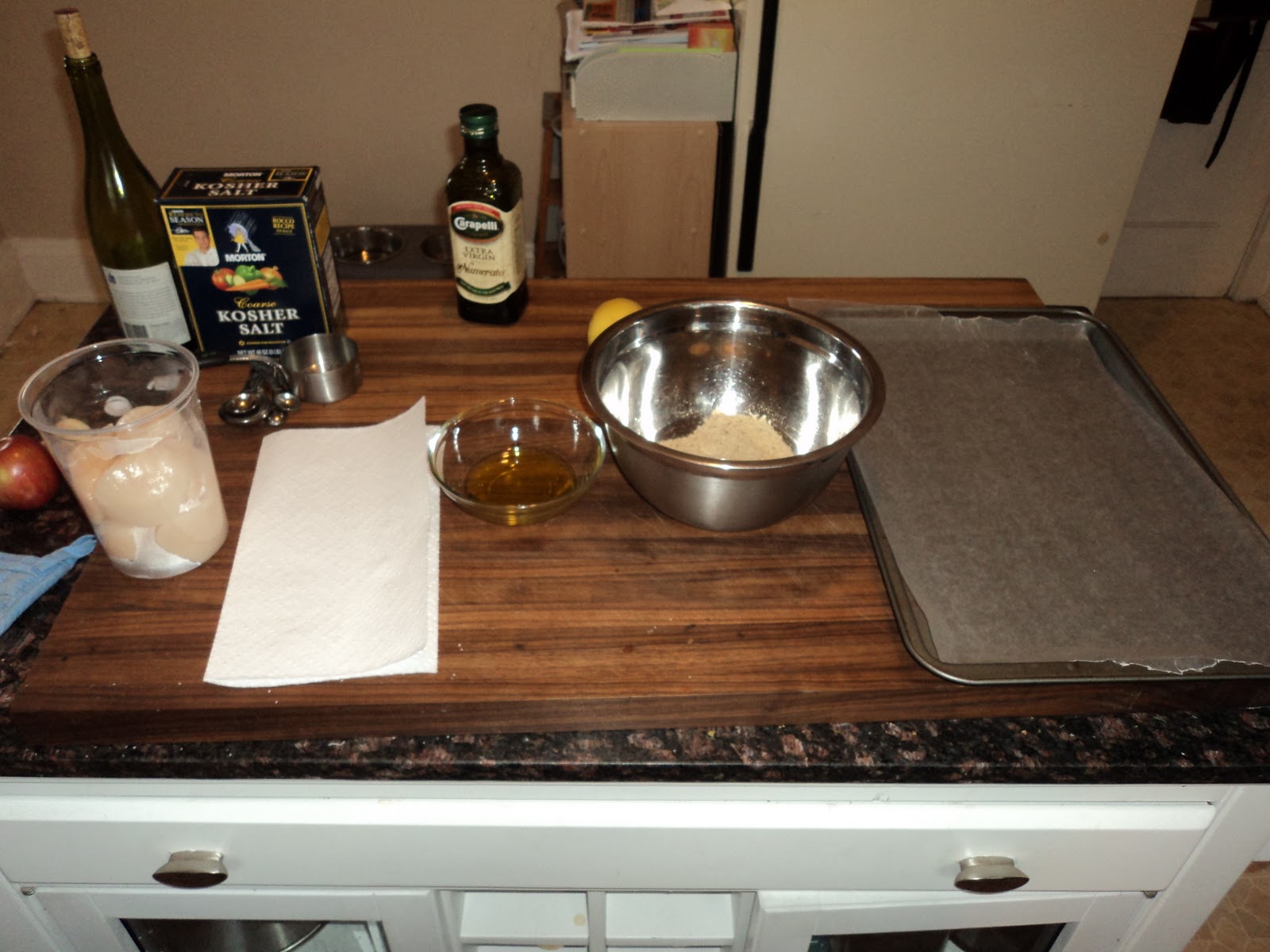 Meanwhile, the first step for dinner tonight was to set up a breading station. In order to avoid cross-contamination, everything would always move the same direction. Here's my station: