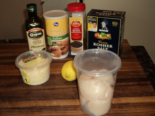 Never before in the last year of doing this blog have I anticipated something so much, and was let down as much. But I'm getting ahead of myself. As I am The Diet, I wanted to grill up some shellfish. The Bride expressed interest in either shrimp or scallops, and I found a recipe that I had been holding on to for a while, the Parmesan Breaded Scallops With Lemon Garnish on page 314.