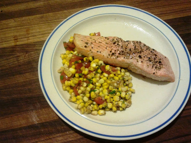 Once again, this recipe was a big success, especially in regards to how easy and low maintenance it is. Let's face it, you boil and cut some corn, cut some tomatoes and basil, make a simple dressing, and grill salmon for ten minutes. It's super easy! As for the taste...YES! It was truly "fresh" (two meals in a row I've used that theme) and delightful. The salmon only needed the salt and pepper, and would have stood well on its own. When put on the same fork as the salad it simply sung. The corn was indeed tender, the fresh basil from my garden was in the background lending its support, and the tomatoes were in the perfect quantity to be noticed but not drive the salad. The dressing was bright, flavorful, and also in a perfect ratio to the salad. In all, this recipe uses just a handful of ingredients, is super simple to cook, won't make a mess in your kitchen, and is a nice change of pace on a hot summer day. Too bad no one in China will learn how awesome I think this is.