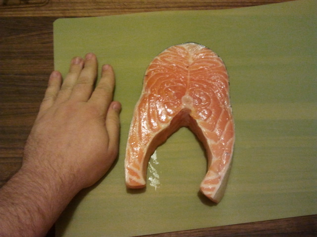 Here is the salmon steak, with my hand used for scale. This thing was NICE!