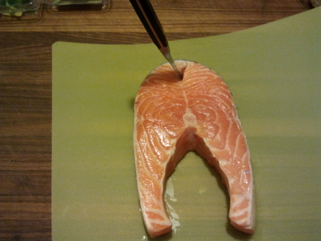 Here you can see I've cut down one side, cutting through the occasional "pin bones" on my way down.