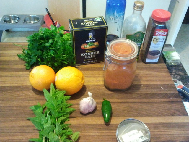 I can sum up my impressions with this fact: I had two full plates of what you see above. DELICIOUS! The marinade/sauce was amazing. The Bride likened it to a mint chimichurri sauce. As a marinade it is flavorful, but takes quite a bit of time to impart its work. As a sauce, however, let's just say that it will be repeated in the Bogdan household, and it may even be seen by company once fully modified. The salad, though, will not be repeated. It was good, but it wasn't to The Bride's standards. She severely dislikes raw bell pepper, of which this salad had two cups worth. Personally, I liked the dressing, as I found it especially bright due to the fresh lemon juice, which I like. My only problem with this salad is the sheer volume. This is a wasteful recipe if cooking for two. Still, overall, this was a pleasant evening.