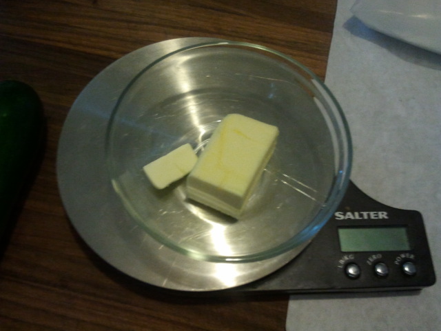 Finally, in examining the recipe, I made one last change. Weber calls for you to melt the butter in a saute pan, and then stir in the soy and ginger. This didn't really sit too well with me, especially with butter's tendency to break. Instead, I opted to create a compound butter, using a technique I learned from the French. First, I had to measure out four tablespoons of butter, which at fourteen grams per tablespoon equaled fifty-six grams.